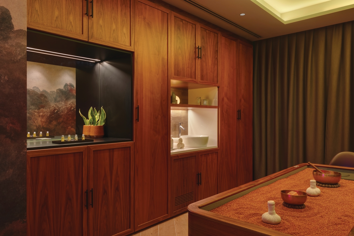 The spa, up on the fifth floor, is like a spaceship, all glossy white surfaces and gently alternating LED lights to ease your tension and boost your mood. It’s themed according to the elements and each treatment room has its own distinguishing feature.