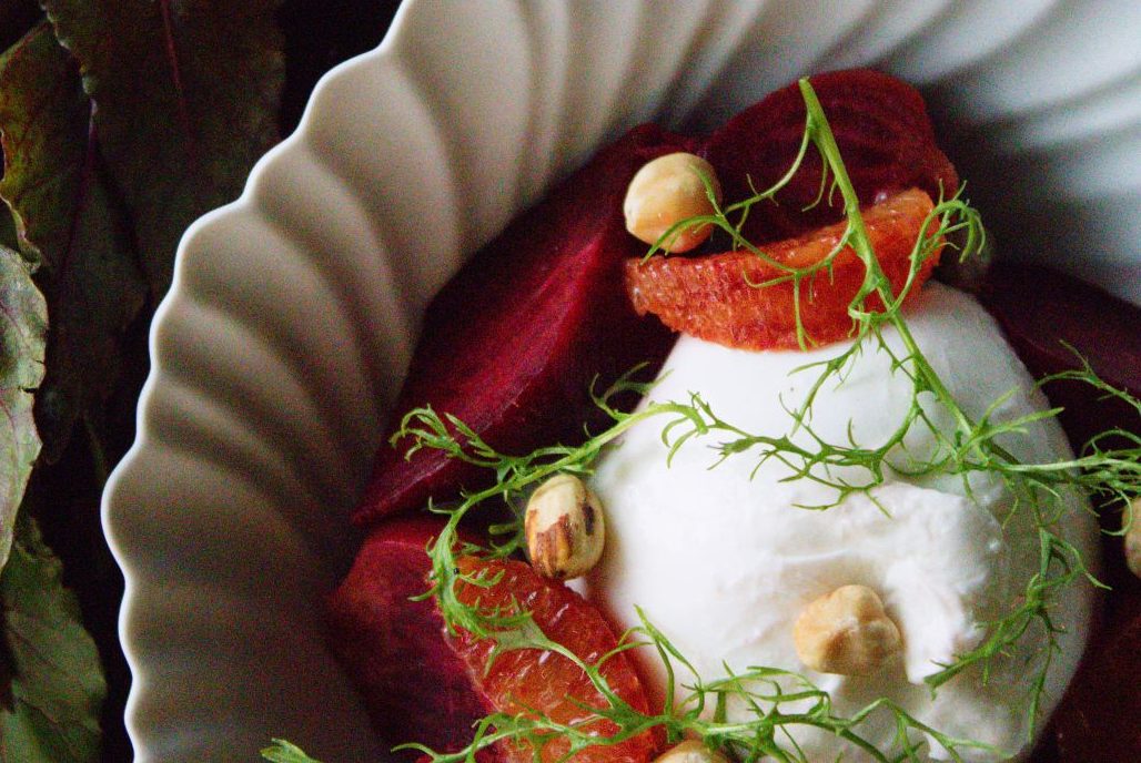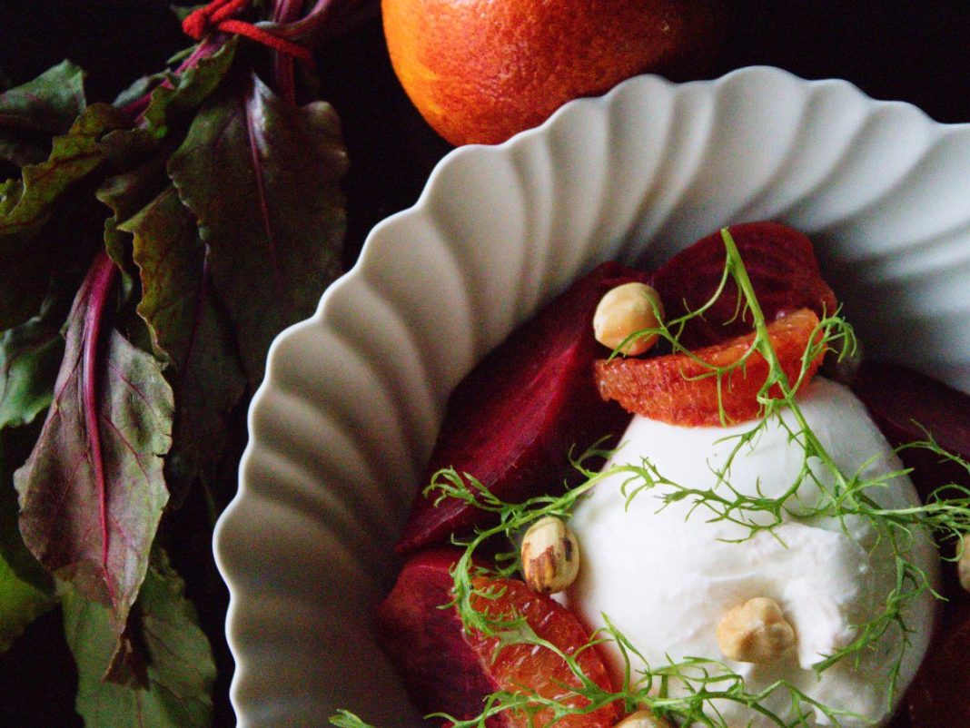 - Add the burrata in the centre of the bowl. Arrange the sliced beetroot and blood orange segments around the burrata.