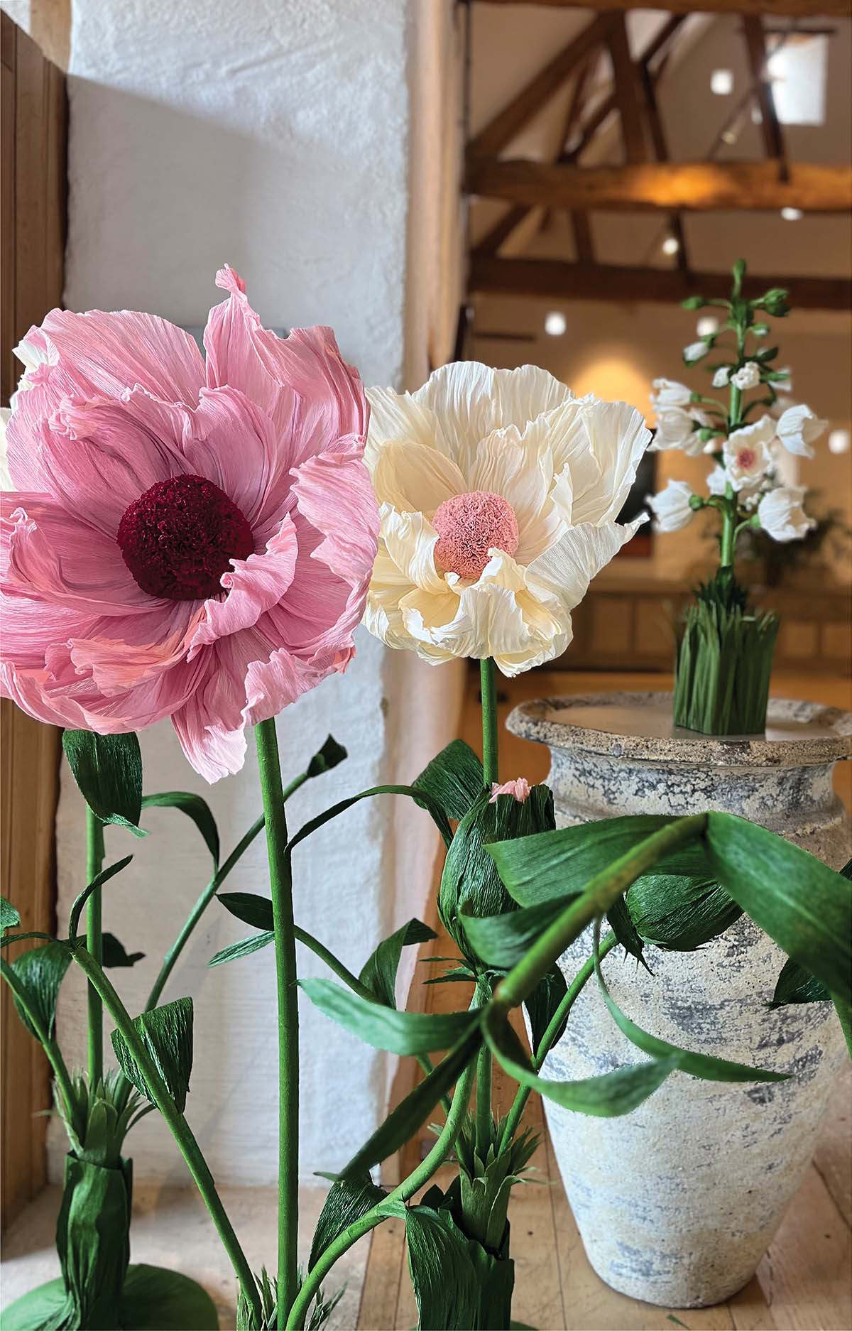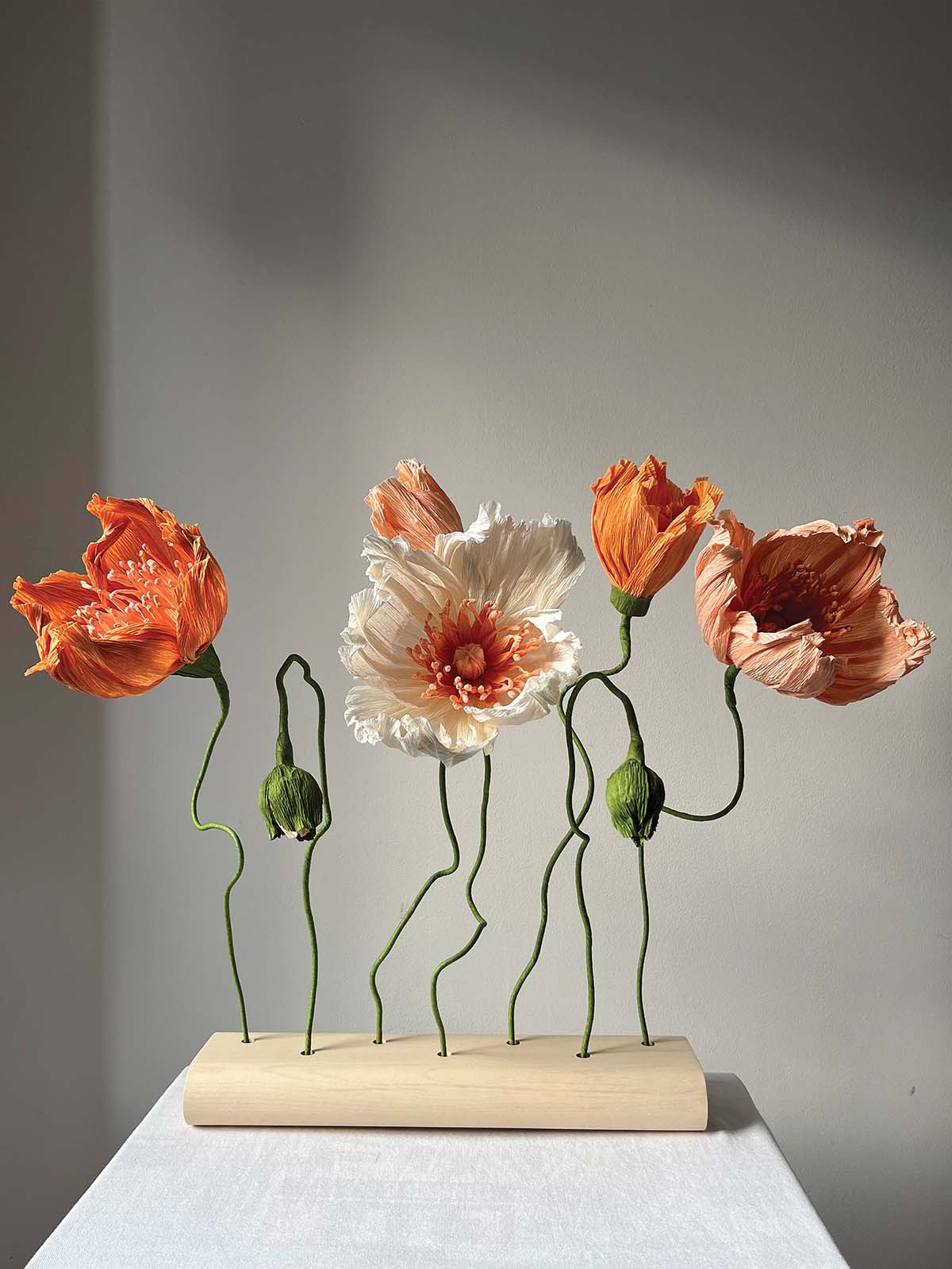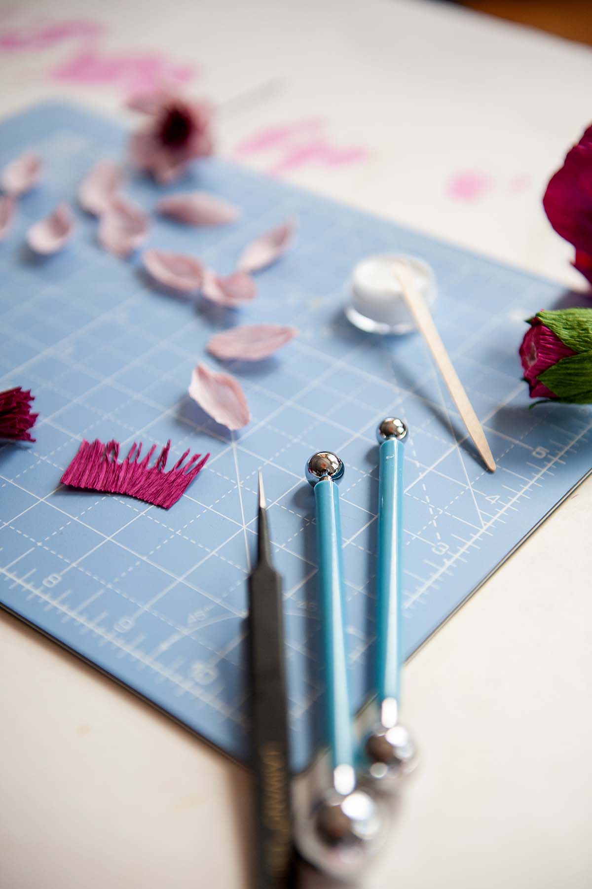 My main material is Italian crepe paper – there are only two factories in the world that produce this kind of paper. What makes it unique is its plasticity and versatility. It’s a very sturdy paper that holds its shape for many years, which gives my flowers a sustainable quality. I like to call them forever flowers.