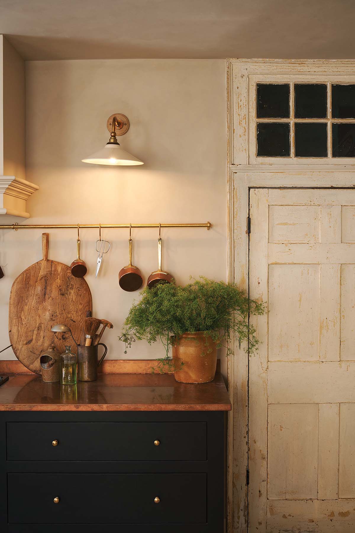That worktop was a labour of love and indeed part of a three-year passion project for Banjo. This worktop is made from sheets of copper which are formed around a piece of timber before being hammered and welded into shape. “This was then aged in our workshop,” explains Helen, “to a perfect patina that will continue to change and age with daily use.”
