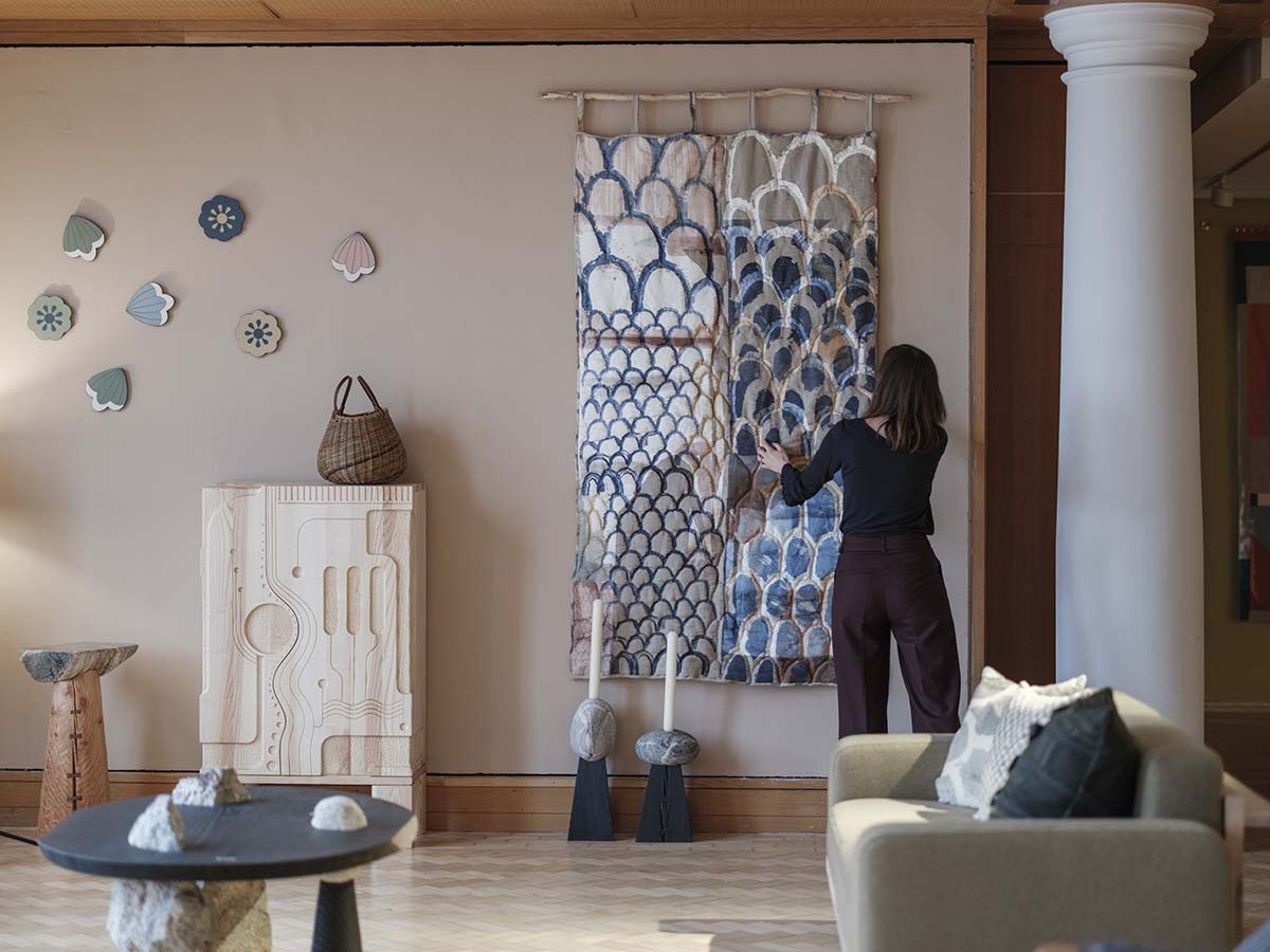 The ‘Talismans’ room separator by screen printer and quilter Katie Charleson is backlit by arch-top windows that look onto the Balmoral Hotel. The piece is made from birch ply with modular fabric panels utilising a recently developed technique of natural dye monoprinting. Daylight diffuses through the panels filling the room with the soft glow of the morning sun.