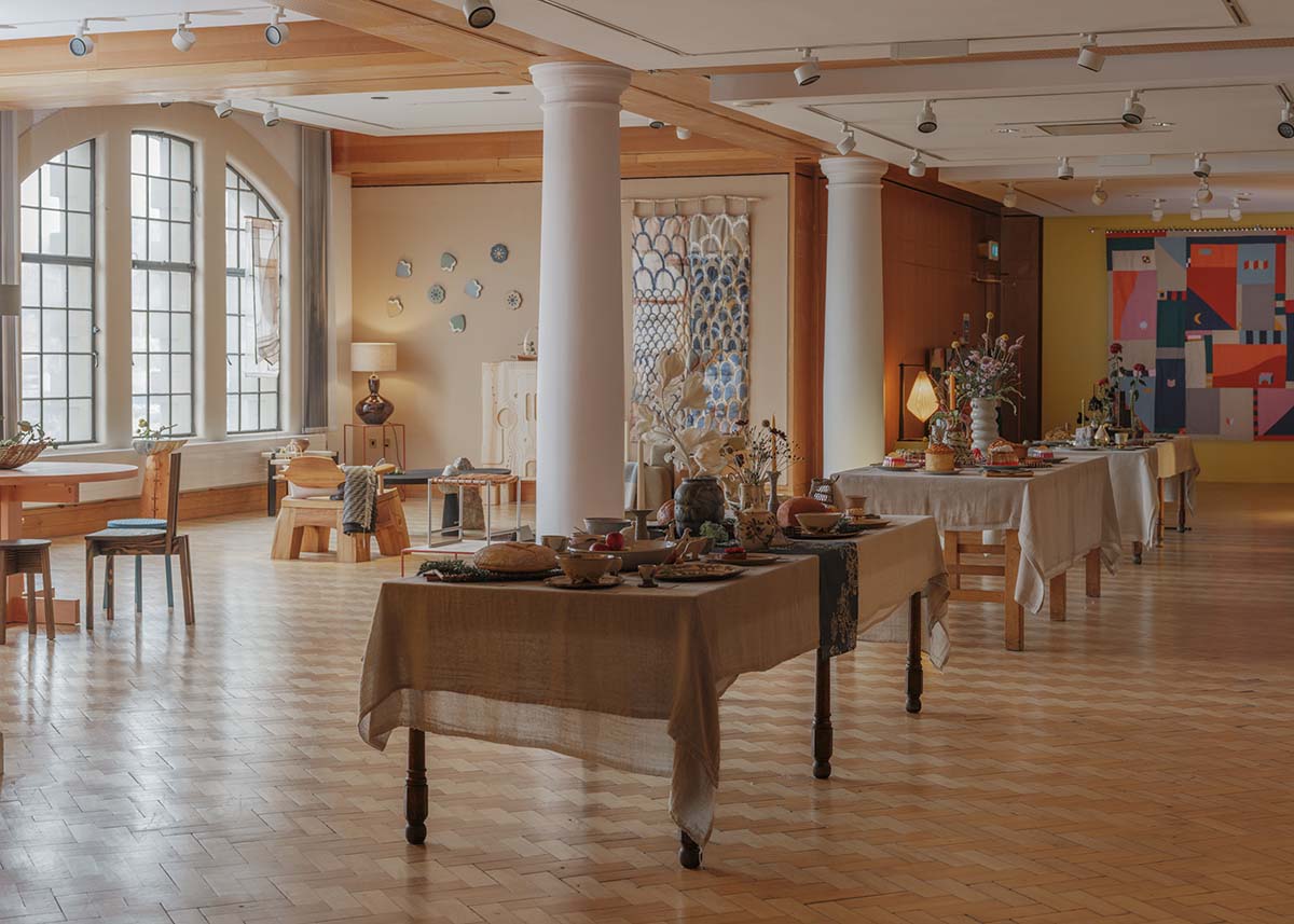 Two banquet tables demand attention in the middle of the room, dotted with creative tableware and trinkets. Botanical sculptor Natalia Manczak’s paper florals take centre stage, made with Italian crepe paper that famous design houses like Creed and Gucci have dressed their tables with. Playfulness is sewn into the setup with deliciously realistic foodie ceramics made by Fake Food Workshop. A beautifully-imperfect sharing bowl by Glasgow-based ceramicist Camille Biddell sits next to an almost-metallic glazed plate from wheel-thrown potter Claire Henry.