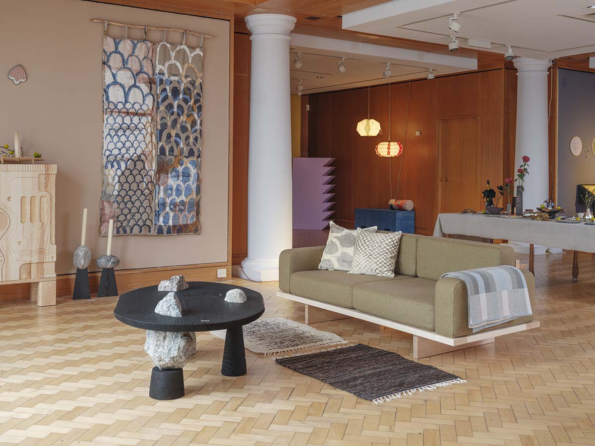 The room is zoned by various pieces of furniture made specifically for the exhibition. A highlight is the Low Sofa by Studio Teller made with ‘Magic’, a soft, high performance fabric by Bute Fabrics. It has a versatile mélange palette speckled with rust fibres that Studio Teller designer Ross Baynam says “brings a nice connection to the HARVEST theme, with subtle orange hues that reflect the progression from summer into autumn. We want the sofa to be a minimal, quiet place of rest.”