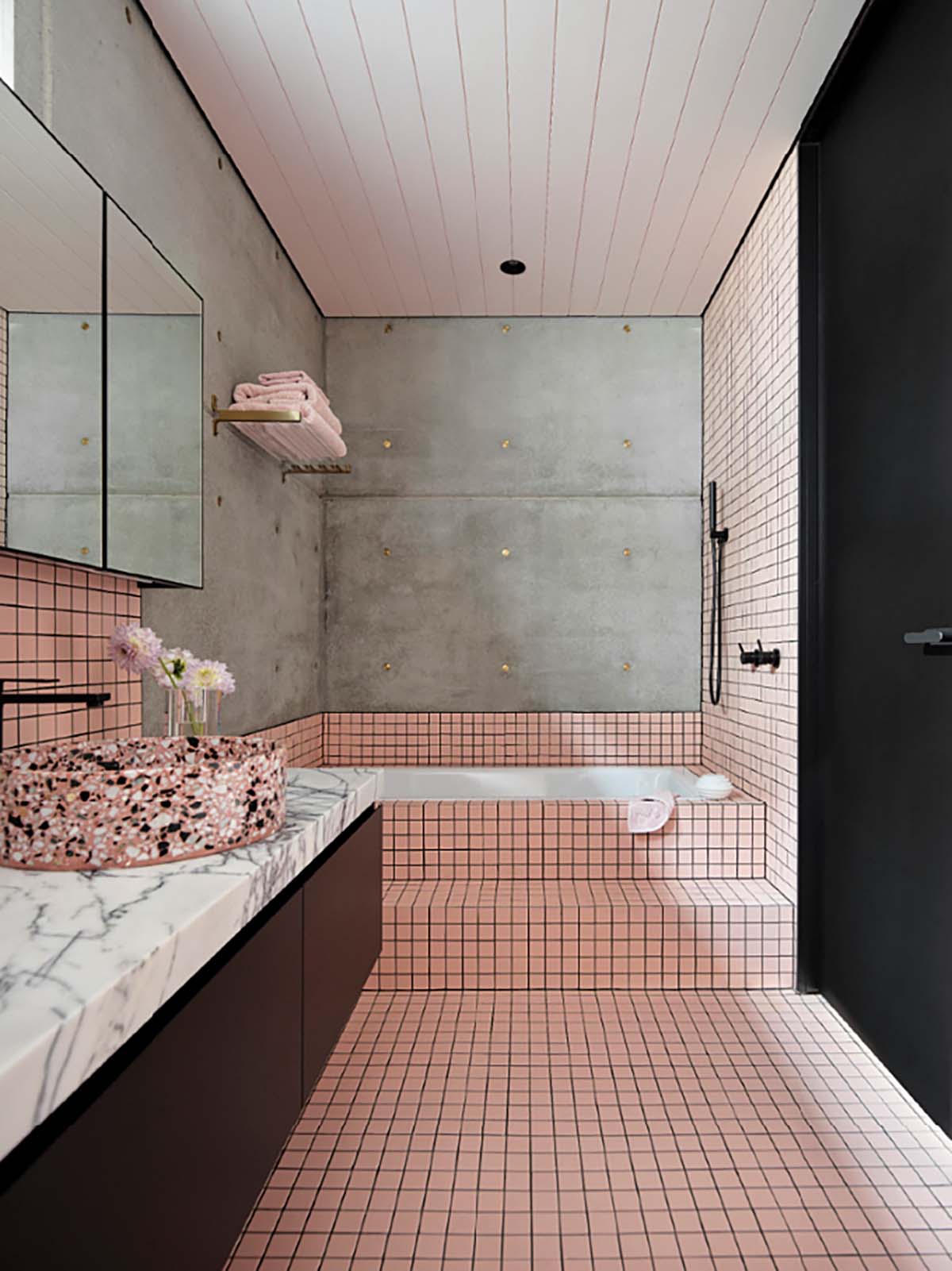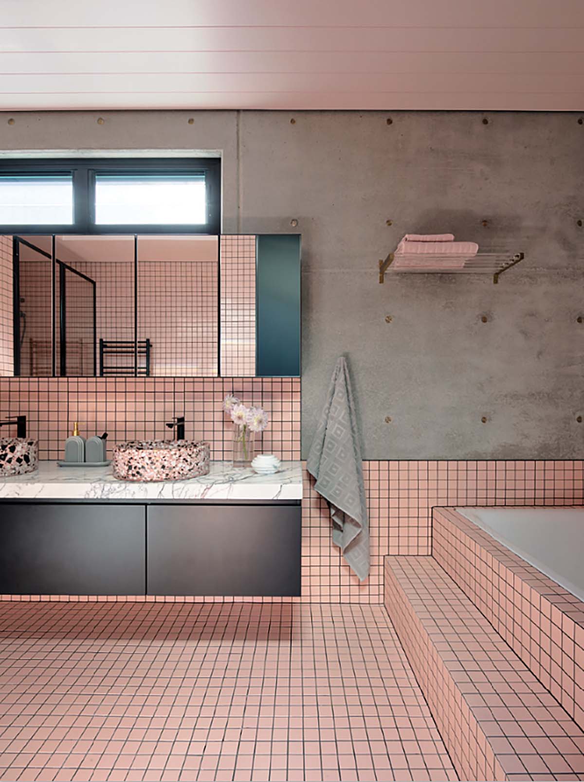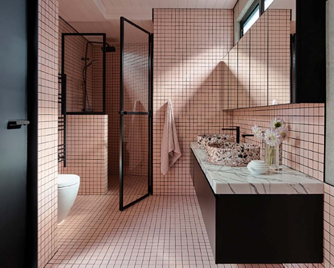 The walls are covered in square Vogue System tiles from the Italian brand Ceramica Vogue. Much of the sanitaryware is from Nero Tapware (showerhead, basin mixers), chosen in a matt black to offset all the pink. The walk-in shower is framed in fluted glass to maximise light. Two round terrazzo basins add a touch of playfulness to the vanity area. “Because this bathroom is shared by the two girls, it was important to incorporate a double vanity with it is to give each person their own area, while still keeping the design cohesive and practical.”
