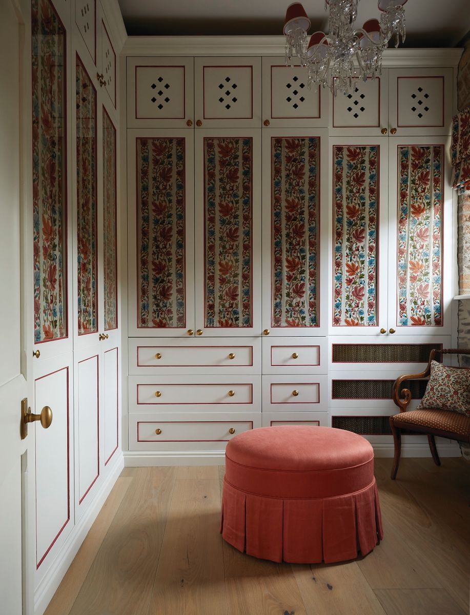 The same hand-embroidered fabric is repeated behind the wardrobe doors: “Pierre Frey’s archive-inspired prints have the right balance of colour, romance and history.” And it’s not just clothes that these pretty doors conceal; Suzie integrated a washer and drier into this space for additional functionality.