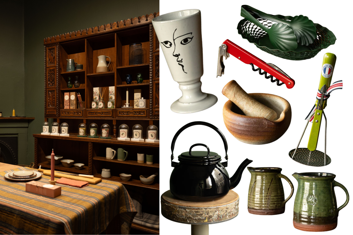 Enamel kettle (£52), Joshua William jug (£70), Roger Orfevre’s Masher & Peeler (£18), Muchelney Pottery’s pestle and mortar (£48), Cartailler’s Deluc Corkskrew Luxe (£36), Roger Orfevre’s Pine Green steel basket and bakery tongs (from £18), Carron Paris’s Toi et Moi vase (£140)