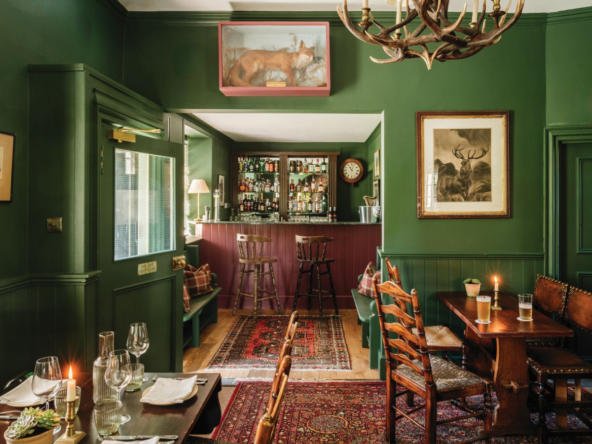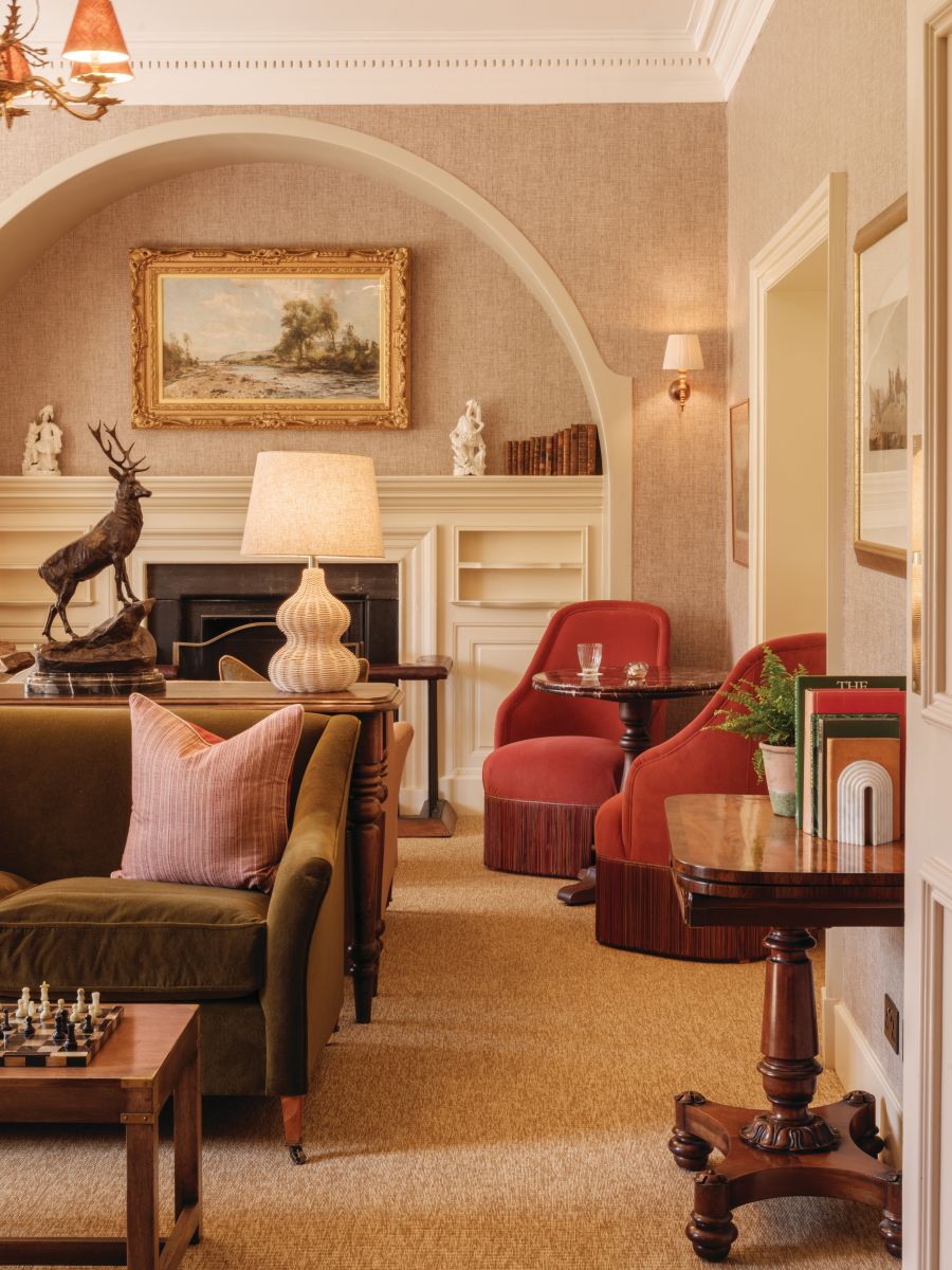 Cream woven carpets and Persian rugs brighten each space downstairs while contemporary pieces like cherry-red baths, smartly piped velvet headboards and terracotta tiling bring playfulness to the upstairs bedrooms. “We wanted the hotel to have a sense of place, without resorting to tartan carpets and taxidermy mounts in every room,” explains Annabelle. There are yoga mats in the wardrobes that she hopes will encourage guests to engage in wellness practices. “We ask you to pause, connect with the land and indulge in good food.”