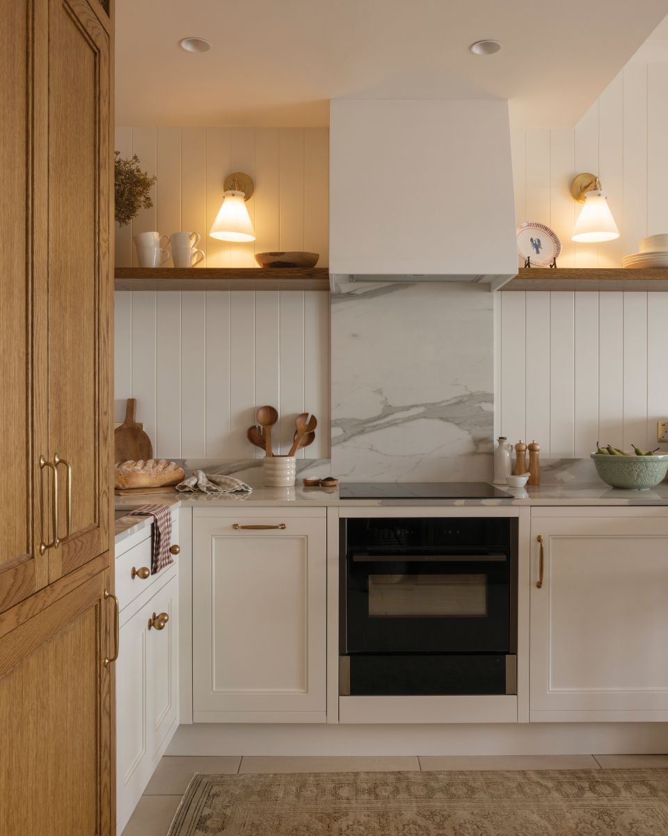 The flat consists of two bedrooms and an open-plan kitchen-living area, and wasn’t in the most inspiring decorative order when Louise and her team first headed to the coast to see it. “I don’t think it had been updated since it was built – it really lacked character,” recalls the designer. “I felt it needed work, a bit of love and attention. It was just old and dated, with a layout that wasn’t very practical.” Her first steps were to make some structural changes to tackle that lack of practicality, before moving on to the aesthetic elements. “We needed to take a partition wall down that was just there as you walked into the kitchen, on the left-hand side,” she explains. “It was cutting off that area, making it a difficult space. It’s a very small kitchen anyway, but having that partition wall made it feel really closed in and tight. Taking it out instantly made it much more usable.”