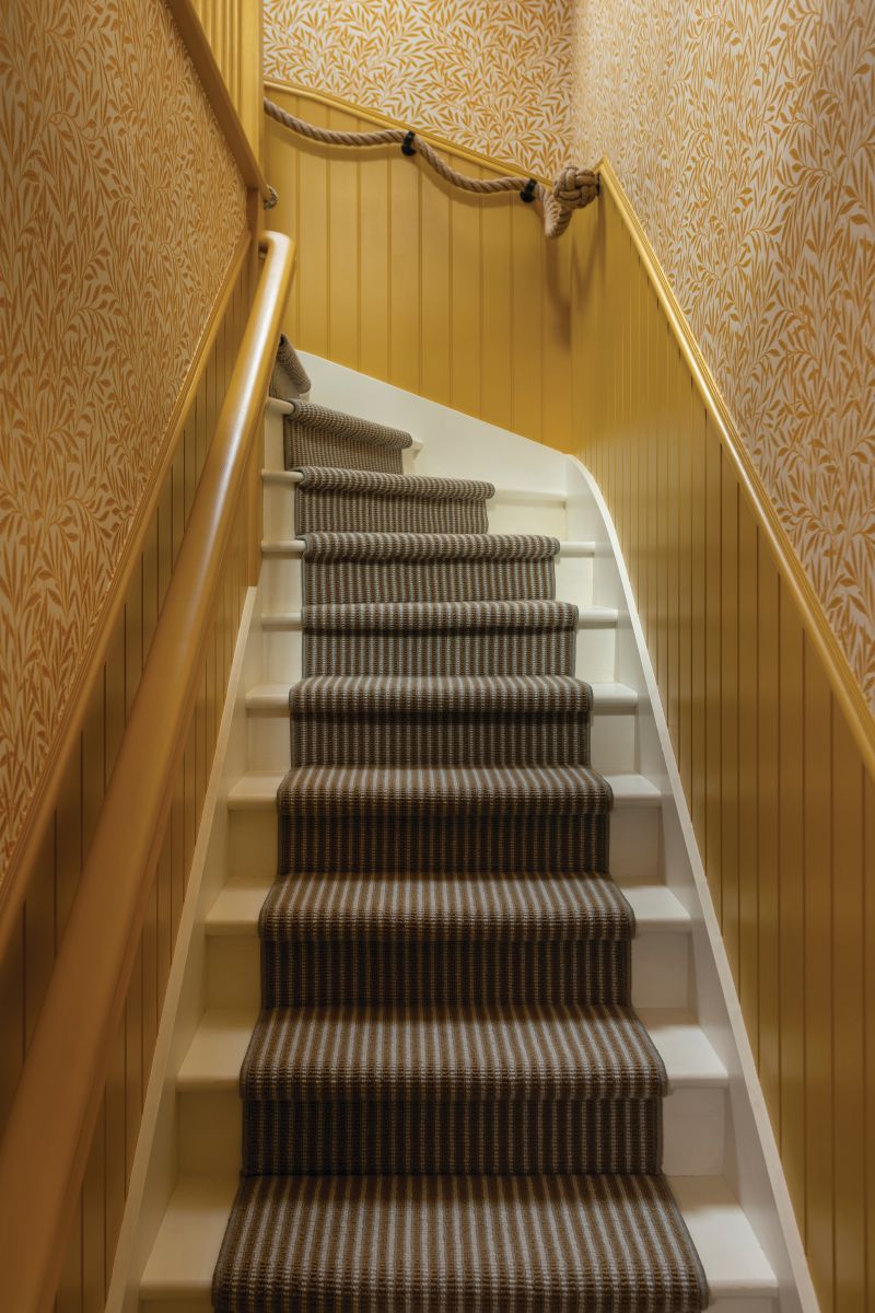 That’s exactly what we decide to do, even cancelling our dinner reservation the night we arrive because we’d rather hang out in the house. With the floral blinds drawn, we can pretend it’s summer; much of the two-storey, three-bedroom cottage is awash with cheerful colour and botanical-patterned textiles, and the ground-floor tiles, overlaid by jute rugs, remind us of a Portuguese villa. Apple-green stools are tucked into a pink kitchen island, and the Morris & Co sunny yellow Willow wallpaper running up the stairs and into the landing is like a field of ripening wheat.