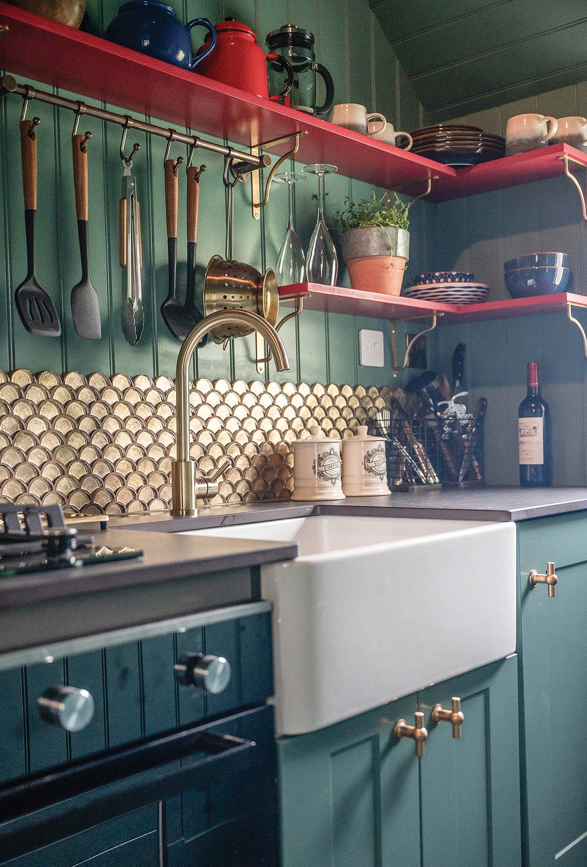 The panelled walls are painted in a bold palette of teal and cherry, and there are high-end details: Art Deco-inspired tiles from Fired Earth, Pooky light fixtures, brass coat hooks by Corston. Warmth comes from sheepskin throws and soft tartan chairs from Homer in Aberfeldy. The alcove bed in the living room is a wonderful use of the limited space, cleverly zoned by thick woven curtains that, when drawn, create a pillowy den that we bundle into each evening with childlike excitement.