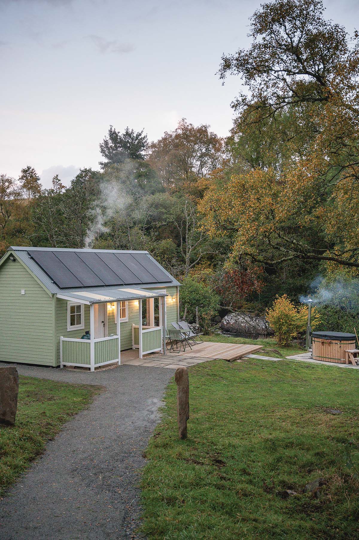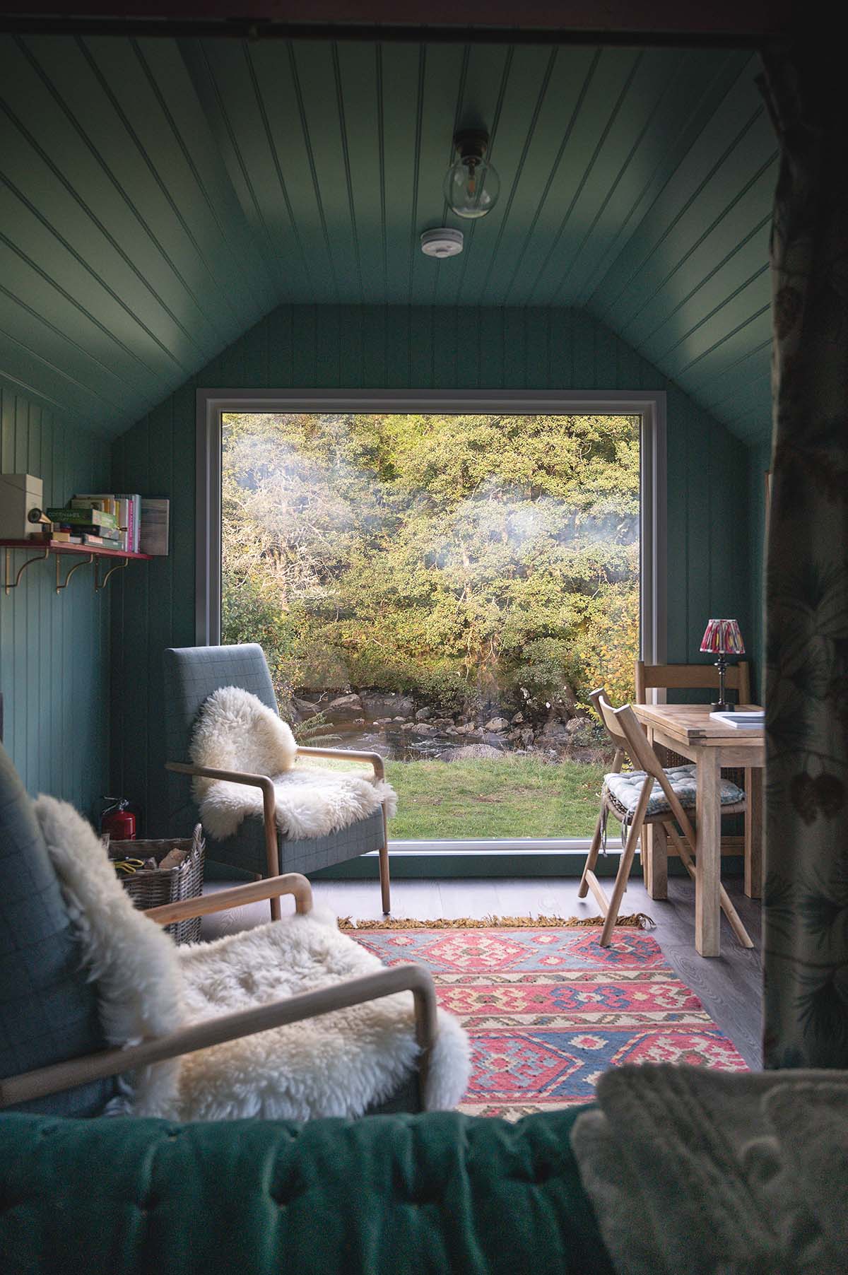 Owners Lucy and Will Holt worked with Casa Architect of Aberfeldy and Dunville Designs of Dunkeld to transform this once-crumbling fishing hut into an off-grid bolthole that boasts all the swagger of a boutique hotel. “We love the Scottish countryside, but we weren’t prepared to compromise on creature comforts,” says Lucy. “Our goal was to make River Cabin ooze luxury despite its wild location, so there’s a fitted kitchen and a cosy double bed with down pillows.”