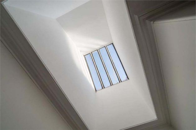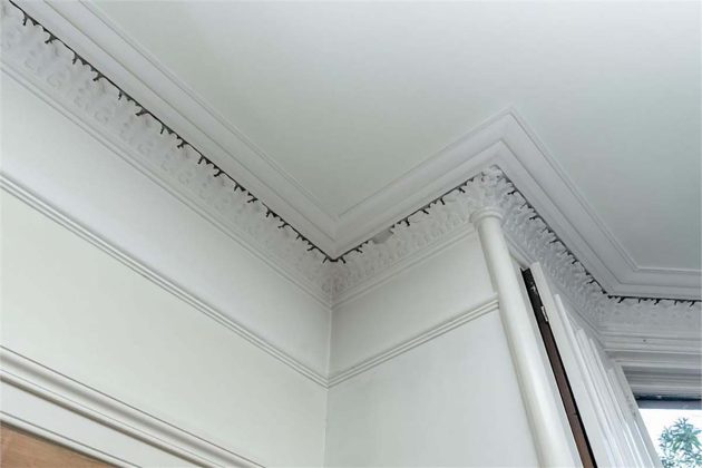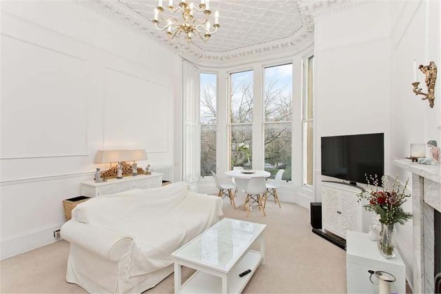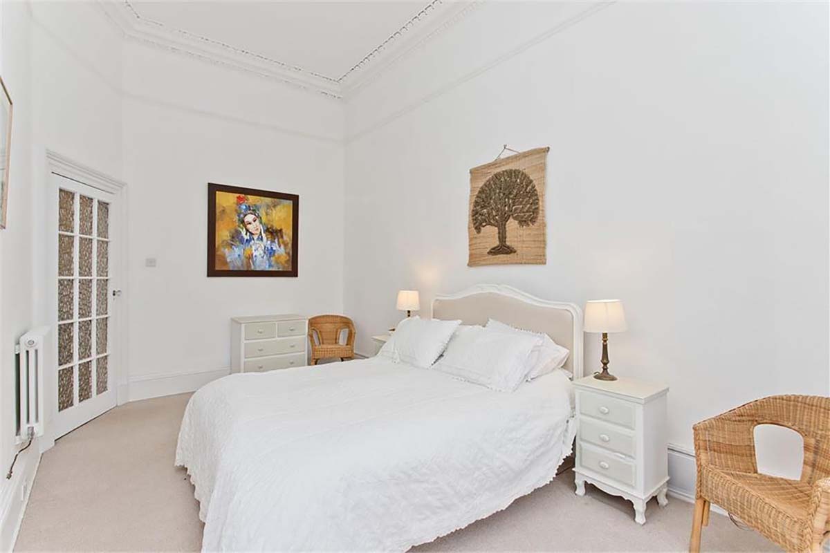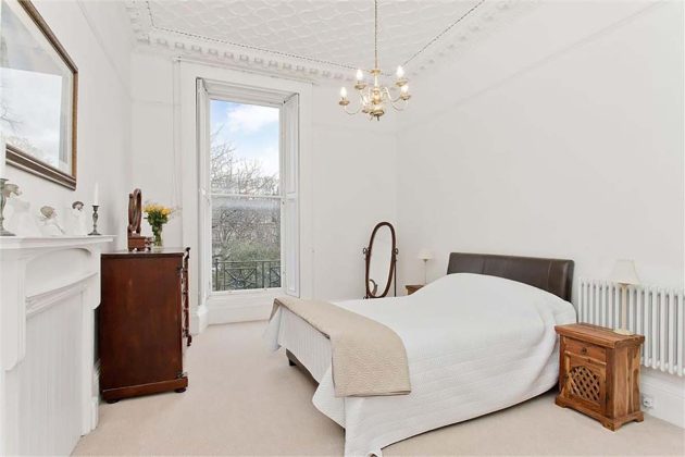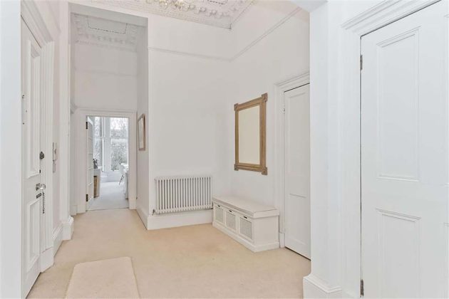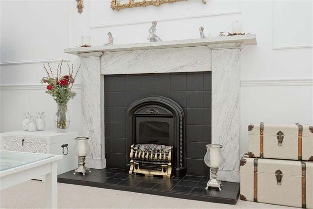 A grand downstairs entrance, featuring marble fireplaces and art-deco doors, acts as a portal to the distinguished apartment interiors upstairs, where a monochrome colour scheme of white and charcoal is offset by soothing cream carpets and elegant cornicing. A highlight of this B-Listed Victorian property is a marble fireplace with a perfect matte surround that has been kept in pristine condition.