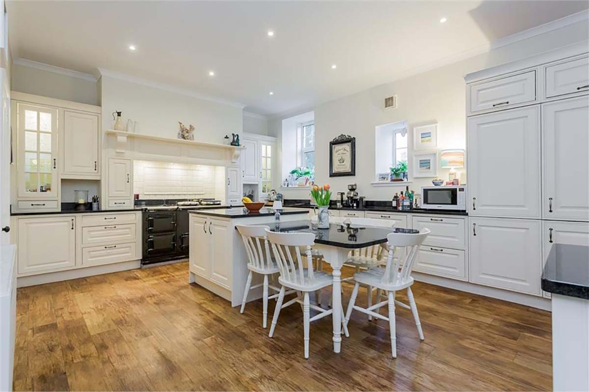 Inside, a welcoming hall leads into an impressive open-plan living, dining and kitchen space, centred around traditional bay windows with views across the landscaped grounds. Elegant period features, including ornate cornicing and a feature fireplace, sit alongside a contemporary kitchen with quality units, integrated appliances and a Belfast sink.