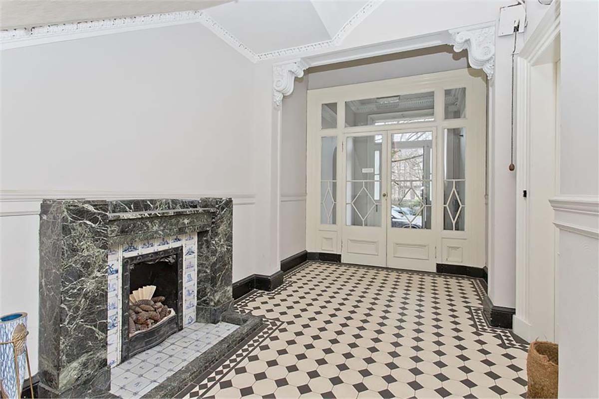 Period details: Encaustic tiled entryway leading to white cornicing and restored marble fireplaces in the main home